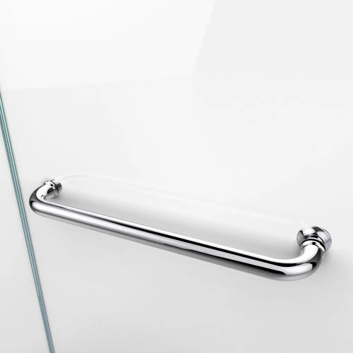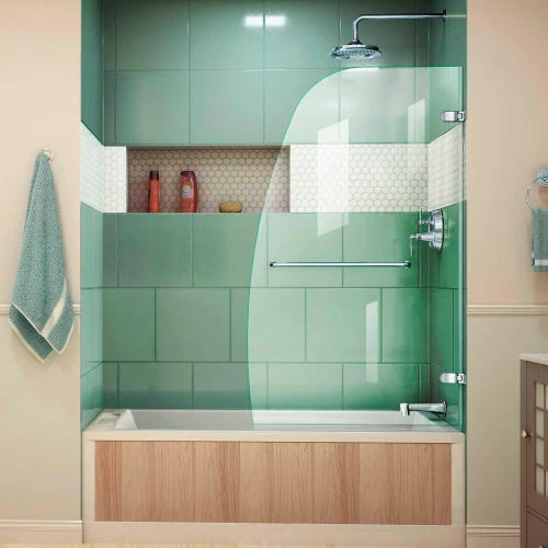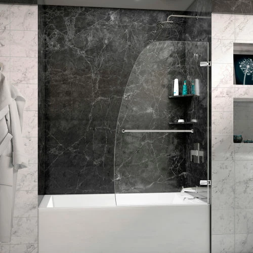 The AQUA UNO tub door is a single panel swing door with European style. The glass tub door has a striking curved silhouette and sophisticated frameless design giving it the look of custom glass. The tub door uses solid brass wall-to-glass hinges designed to open outward from the tub. The glass door is fitted with an easy to reach towel bar that doubles as a handle. Hardware is available in chrome or brushed nickel finish. The swing tub door is reversible for left or right wall installation. Let the AQUA UNO swing tub door from DreamLine™bring a fresh modern look to your bathroom makeover.