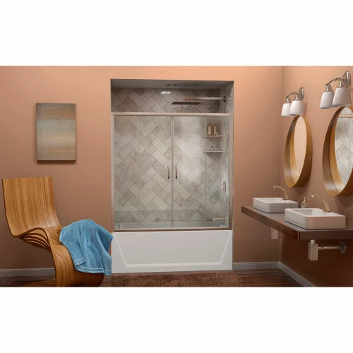 The DreamLine™ VISIONS tub door collection offers a simple, yet elegant door design for any bathroom. With center opening sliding doors, anodized aluminum framing in a choice of chrome or brushed nickel finish and options of clear or frosted glass VISIONS doors offer a great solution for any bathroom remodeling project. The width may be further adjusted to 56 if required to fit a more narrow shower or tub opening. The smart design of the two sliding doors includes full length magnetic strips and fast wheel release for easy glass and aluminum bottom track cleaning.