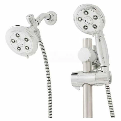 Enjoy rejuvenating Speakman showers at any height — standing or sitting — with the Combination Anystream®; Alexandria Slider Shower System. Featuring the fixed Anystream®; Alexandria Showerhead and slider bar mountable Anystream®; Alexandria Hand-held Shower, this attractive, modern system combines 10 total jets for 100 versatile, full-body sprays. Integrating two new Speakman showers, the styled and Chrome-plated brass 2-way pop-up diverter transfers water from the fixed-mount Anystream®; Alexandria Showerhead to the Alexandria Hand-held Shower. The hand shower and its 60″ no-tangle hose can mount easily to a combination grab/slide bar. Both showerheads are equipped with 2.5 GPM flow controls. The entire shower system is available in Polished Chrome & Brushed Nickel finish.