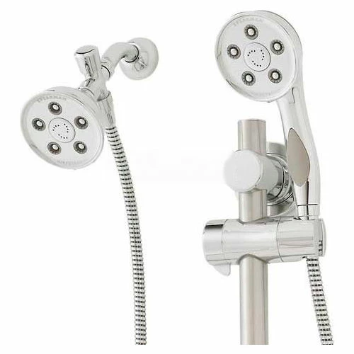 Enjoy rejuvenating Speakman showers at any height — standing or sitting — with the Combination Anystream®; Caspian Slider Shower System. Featuring the fixed Anystream®; Caspian Showerhead and slider bar mountable Anystream®; Caspian Hand-held Shower, this attractive, modern system combines 10 total jets for 100 versatile, full-body sprays. Integrating two new Speakman showers, the styled and Chrome-plated brass 2-way pop-up diverter transfers water from the fixed-mount Anystream®; Caspian Showerhead to the Caspian Hand-held Shower. The hand shower and its 60″ no-tangle hose can mount easily to a combination grab/slide bar. Both showerheads are equipped with 2.5 GPM flow controls. The entire shower system is available in Polished Chrome & Brushed Nickel finish.