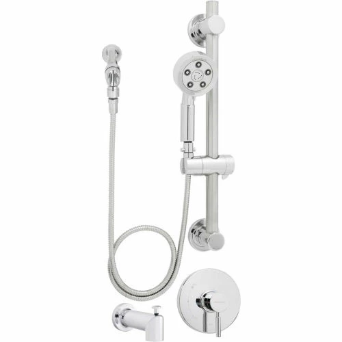Embodying the bold, modern look of the Neo™ Shower & Bath Collection, Speakman’s Neo™ ADA Slide Bar, Hand Shower and Tub Package (SM-1090-ADA-P) continues Speakman’s legacy of luxury hotel showers. Exemplifying quality Speakman engineering, this ADA compliant shower and tub package features a Neo™ hand shower with ADA pause/trickle adapter and solid brass shower arm and flange, coordinating Neo™ anti-scald pressure balance shower valve and trim, tub spout with diverter, and ADA grab bar. Showcasing patented Speakman Anystream® 360˚ technology, the hand shower allows the user to easily transition through 360° of full-flood needling spray, central pulsating massage, or a combination of both by simply rotating the showerhead’s faceplate. Connecting the base of the hand shower to the shower hose is an ADA compliant pause/trickle adapter, which permits the water source to be turned on or off for ease of operation for those with physical handicaps. The durable 60 inch metal shower hose and ADA grab bar add functionality and extra support while allowing the shower head height to be adjusted up or down. A diverter tub spout allows for an easy transition between use of the tub and shower, and an anti-scald pressure balance shower valve maintains a consistent water temperature during use. ADA compliant shower systems offer several advantages including ease of operation for those with physical handicaps. Pair this luxury shower system with any of Speakman’s Neo™ bathroom sink faucets and fixture accessories sets for a sleek, modern look.