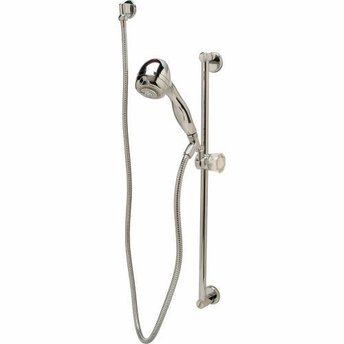 ZURN Z7000-HW Hand/wall shower unit consisting of hand held shower head with swivel connection, 60 flexible metal hose, 24 mounting bar wall connection, with supply elbow & flange. Non-adjustable spray pattern, with 1.6 GPM pressure compensating flowrate regulator
